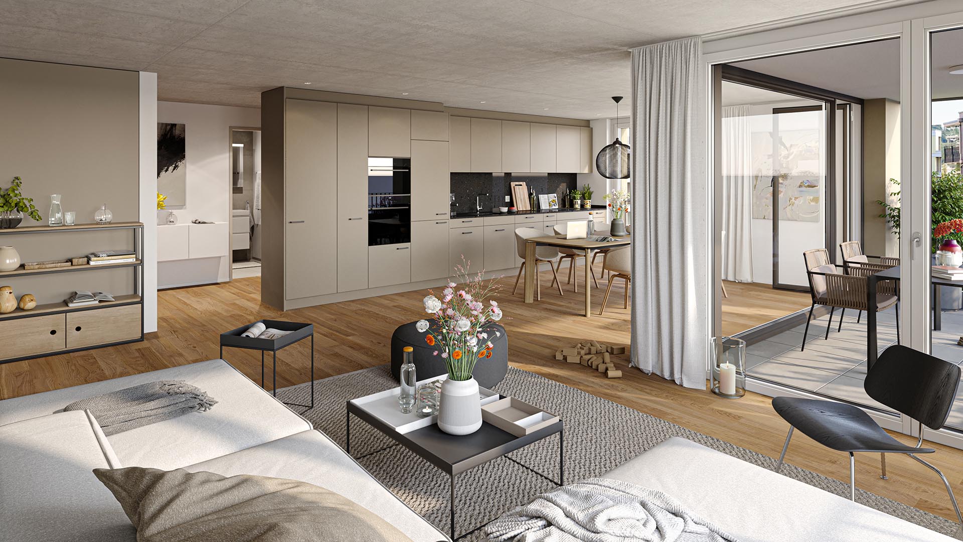 Zwei neue Mehrfamilienhäuser umfassen 23 Wohnungen im Stockwerkeigentum. Es entstehen 2.5 bis 5.5 Zimmerwohnungen mit hochwertiger Ausstattung. Welche Grösse hat Ihr Traum von Wohneigentum?